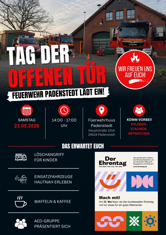 24 Stunden am Tag und 7 Tage die Woche sind die Kameraden der Freiwilligen Feuerwehr Padenstedt bereit, den Bürgern unseres Dorfes in einem Notfall zu helfen. In der zweiten Jahreshälfte wurden wir bisher zum Glück nur vier Mal über den Notruf 112 alarmiert und blicken mit zwölf Einsätzen auf ein insgesamt ruhiges Jahr zurück. Mit dabei ist auch der erste Einsatz unserer AED-Gruppe am 28. Juli.