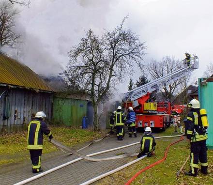 Einsatzkräfte aus Ehndorf, Padenstedt, Nortorf, Hohenwestest und Neumünster waren von ca. 10:30 Uhr bis in den späten Abend damit beschäftigt, eine Scheune mit Wohnung im Erdgeschoss in der Dorfstraße in Ehndorf zu löschen. Speziell das Blechdach erschwerte die Löscharbeiten, sodass es nötig wurde, zusätzliche Zugänge über zwei Drehleitern zu schaffen. Personen wurden bei dem Einsatz nicht verletzt.