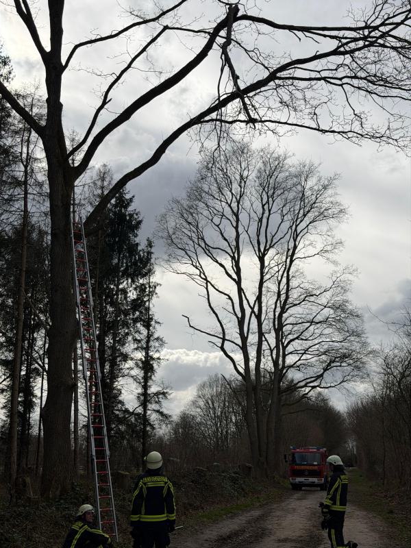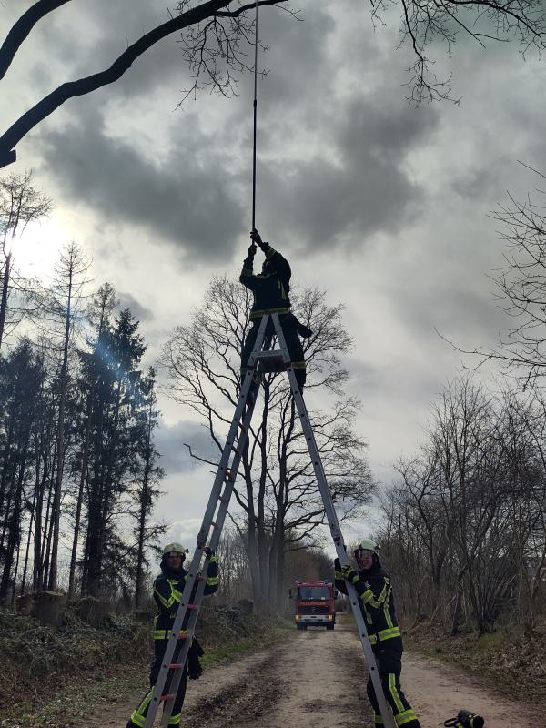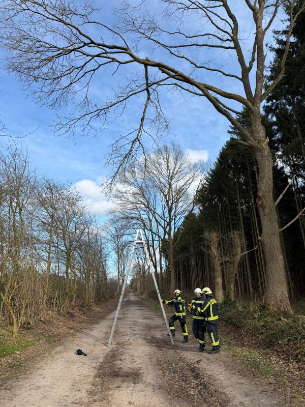 Auf Wunsch unserer Bürgermeisterin Katrin Beckmann haben wir heute Nachmittag den Wanderweg im Barnaheredder gesichert. Ein Ast drohte zu fallen. Mittels Bockleiter und Astsäge konnten wir den Ast einkürzen, aber nicht komplett an der Bruchstelle entfernen. Diese Aufgabe übernehmen die Gemeindemitarbeiter Anfang der Woche. Zum Schutz der Passanten haben wir den Bereich sicherheitshalber abgesperrt.