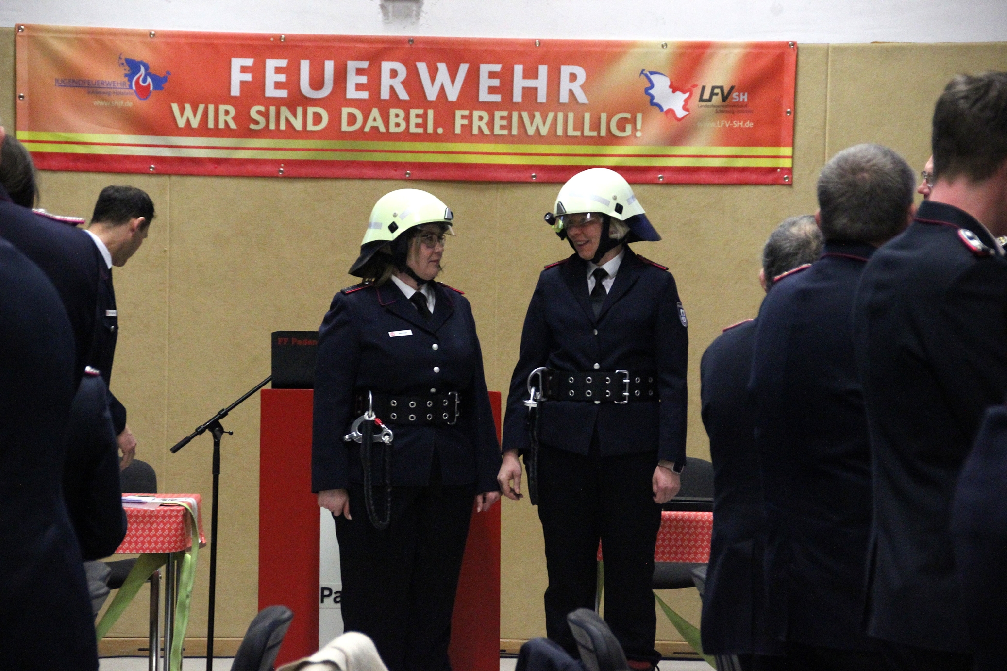 Im Anschluss an den Kassenbericht und den Haushaltsplan 2027, die von Rabea Dannenberg vorgestellt wurden, konnten wir mit Jenny und Kristin zwei neue Feuerwehrkameradinnen nach erfolgreicher Grundausbildung in unsere Mitte aufnehmen. Leider mussten wir auch ein Mitglied per Mehrheitsbeschluss aus unseren Reihen ausschließen, was in 99 Jahren seit Gründung der Feuerwehr Padenstedt bislang nur sehr selten passiert ist.