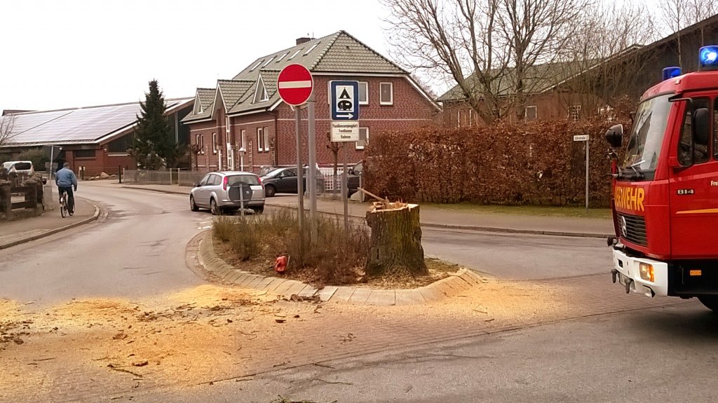 Auf Anfrage von Bürgermeister Carsten Bein wurde die Feuerwehr Padenstedt am 14.03.2015 zu einem ungewöhnlichen Einsatz gerufen. Die Kameraden hatten die Aufgabe, den Verkehr zu sichern, während die 140 Jahre alte Friedenseiche im Dorfzentrum (Kreuzung Hauptstraße / Störstraße / Kleinredder) gefällt wurde. Ein Gutachten hatte ergeben, dass von dem alten Baum eine Gefahr für den Straßenverkehr ausginge und somit wurde die Gefahr nun beseitigt. Nach kurzer Zeit konnten die Kameraden ohne besondere Vorkommnisse wieder einrücken.