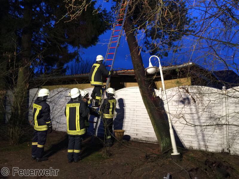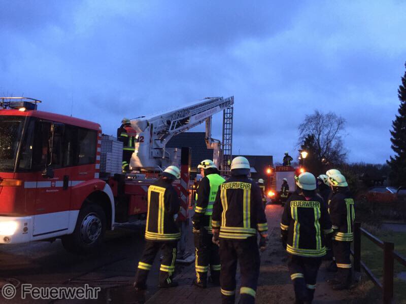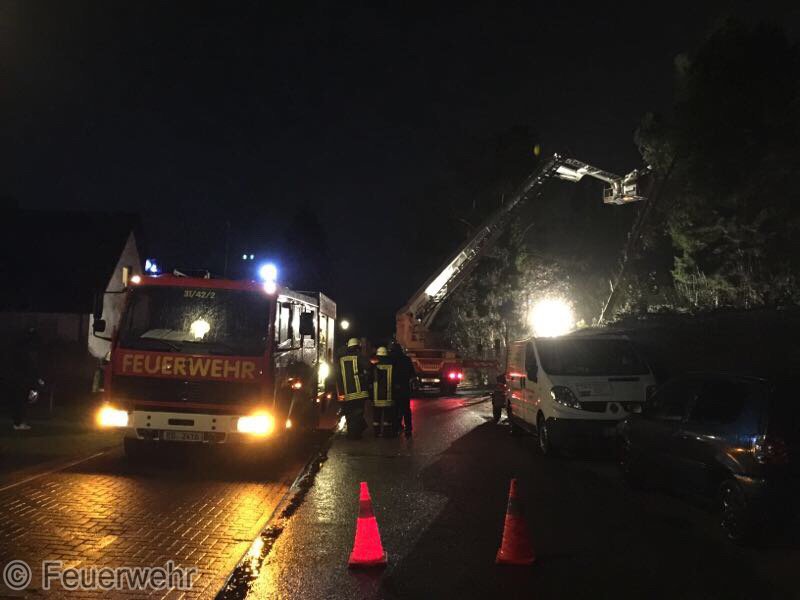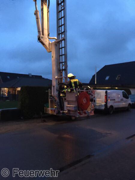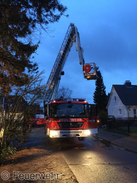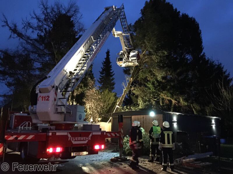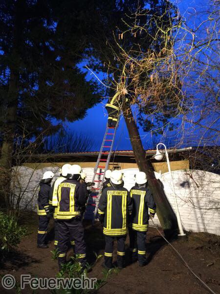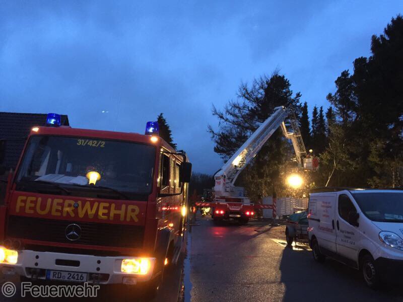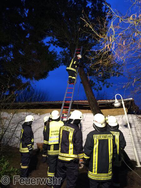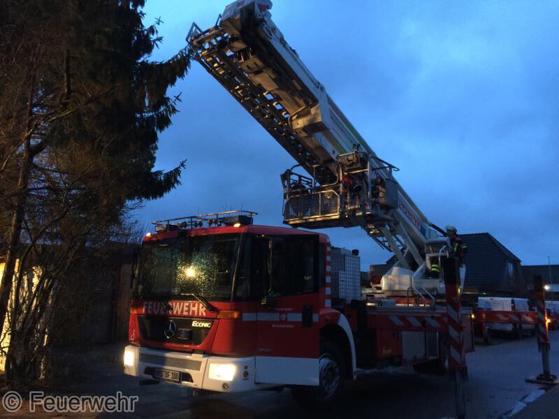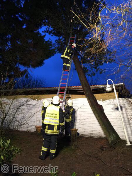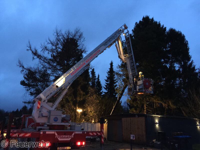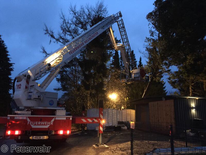 Sturm Niklas machte das Eingreifen der Feuerwehr Padenstedt nötig. Gegen 19 Uhr wurden wir von der Leitstelle Mitte alarmiert. Ein Baum war im Ortsteil Padenstedt-Kamp vom Wind in Schieflage geraten und drückte mit seinem Stamm gegen eine Garage. Es bestand die Gefahr, dass der Baum durch den Sturm komplett umgeweht würde und dann auf das Gebäude fallen könnte. Um weiteren Schaden zu vermeiden wurde der Baum mit Hilfe eines Hubrettungsgeräts der Berufsfeuerwehr Neumünster und eines Traktors sowie unter Verwendung von zwei Motorkettensägen zerlegt. Gegen 21:30 Uhr konnte der Teleskopgelenkmast der BF wieder abrücken, während unsere Kameraden noch letzte Aufräumarbeiten verrichteten.
