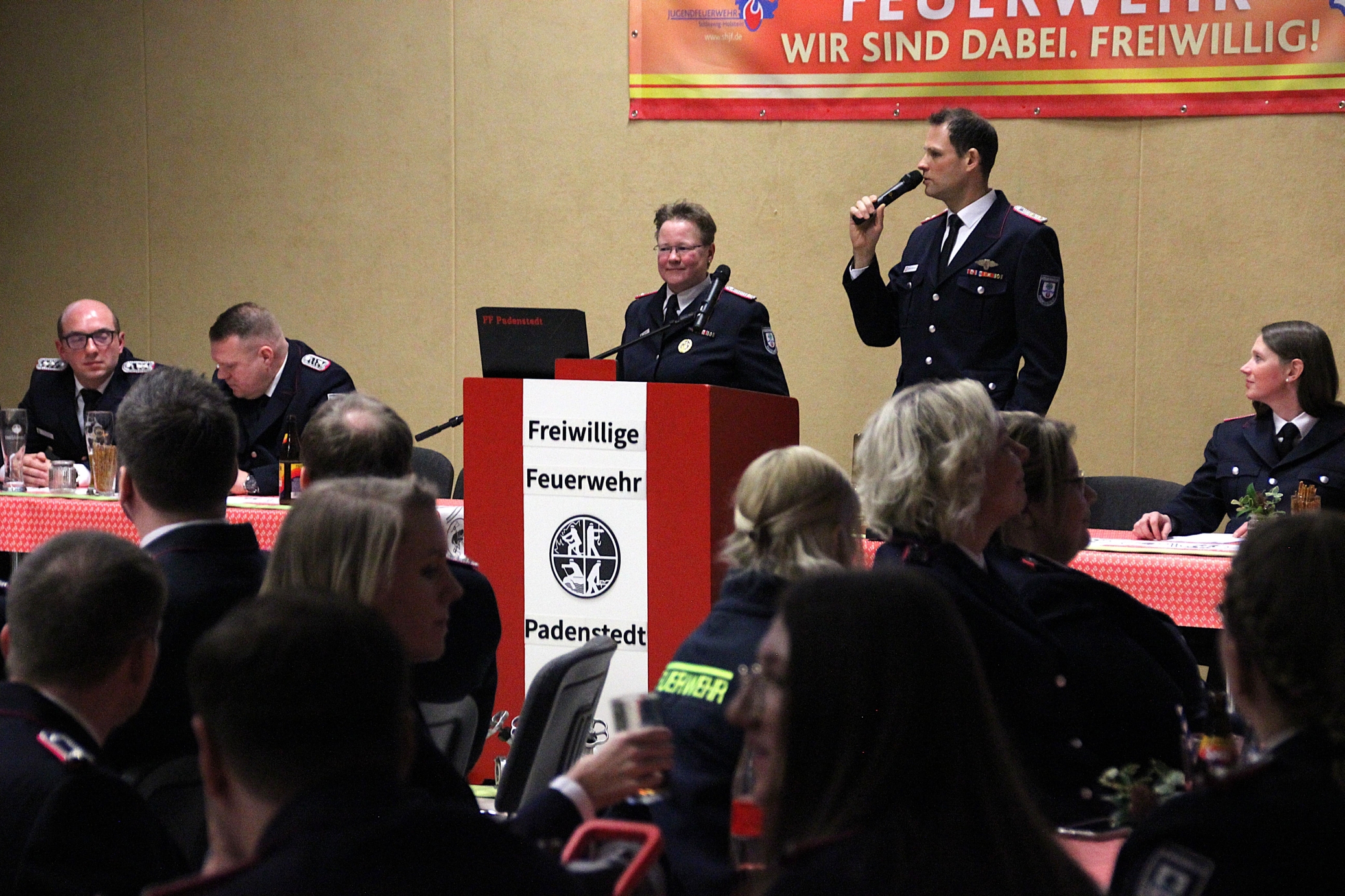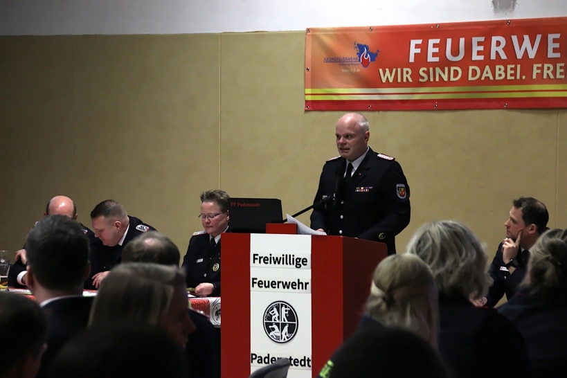 Verabschiedungen und Ehrungen bildeten die Highlights der diesjährigen Jahreshauptversammlung. Doch der Reihe nach, 19:32 Uhr eröffnete Wehrführer Dennis Baumgart die Versammlung mit leichter Verspätung verursacht durch Probleme mit dem Mikrofon. Die Tagesordnungspunkte 1 bis 5 waren schnell abgearbeitet und es folgten die Grußworte von unserer neuen Bürgermeisterin Katrin Beckmann, vom stv. Kreiswehrführer Dirk Hagenah und vom stv. Amtswehrführer Hauke Fürst sowie abschließend vom Stadtbrandmeister der Stadt Neumünster Heiko Kaack. Alle dankten den Kameraden für die geleistete ehrenamtliche Arbeit für die Gemeinde Padenstedt, wobei die Jugendarbeit lobend hervorgehoben wurde. Wie bei uns selbst auch, war das Jahr 2025 auch für andere Feuerwehren im Umland offensichtlich ein ruhiges Jahr.